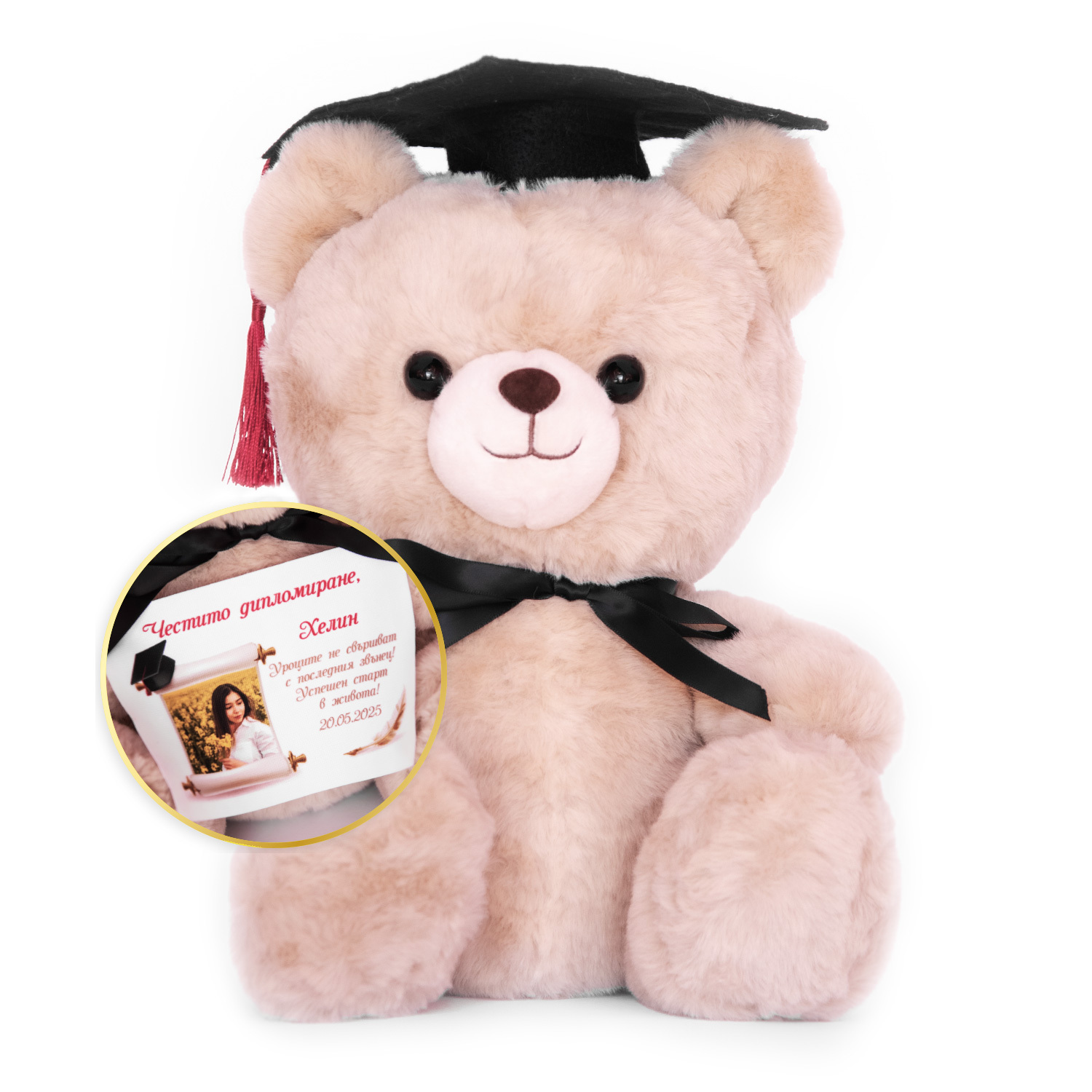 Ще видите няколко модела малки мечета, които са специално създадени за този повод. Какво ги прави толкова специални ли? Те имат отличителни аксесоари, които ги правят още по-чаровни. Мечетата са с абитуриентска шапка и папионка. В ръката си държат специален свитък, на който можем да отпечатаме вашето поздравително послание. Също така на свитъка можем да поместим и снимка с абитуриента.