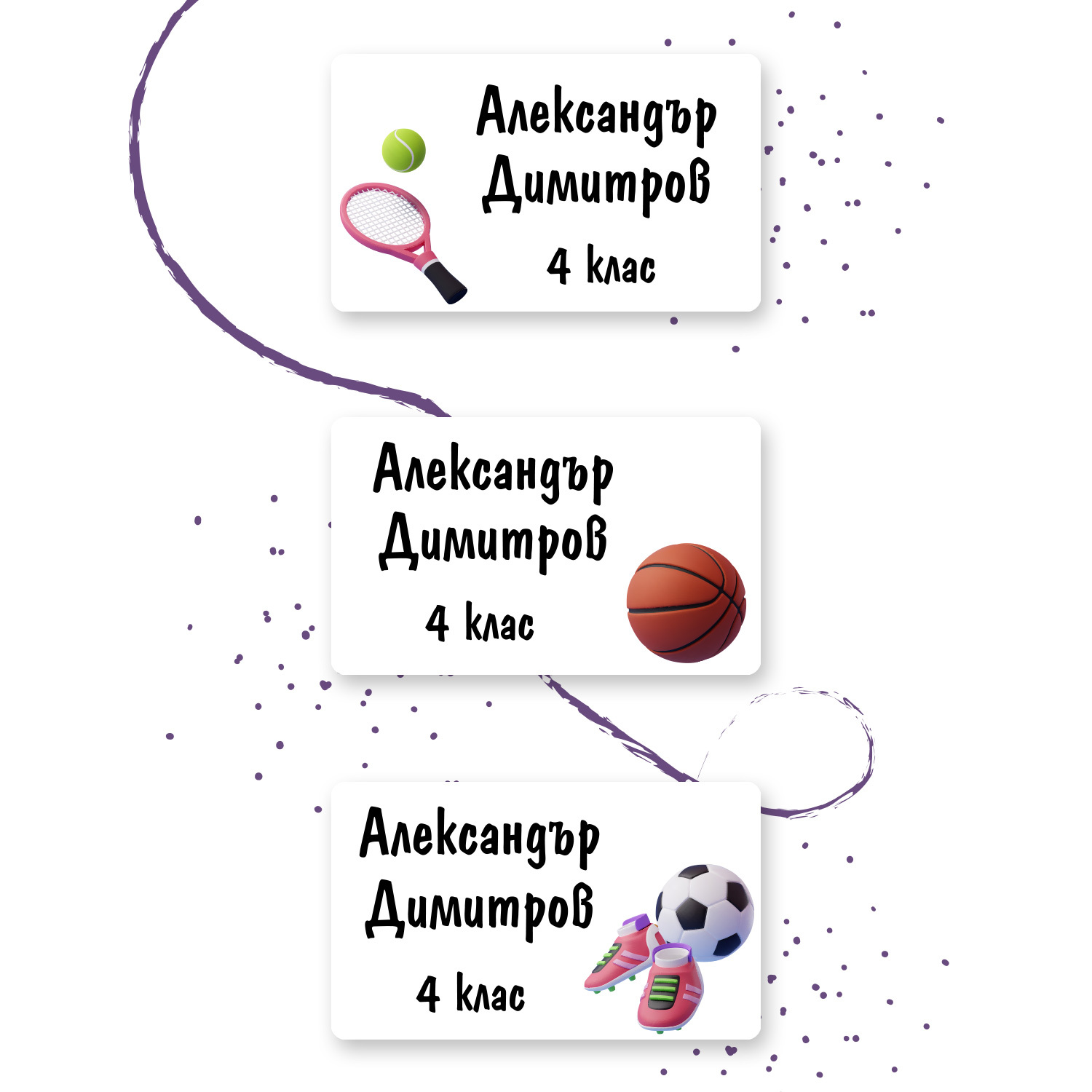Персонализираните етикети за дрехи с дизайн Тенис, Футбол и Баскетбол са създадени специално за нуждите на родители с деца в ясла и детска градина. Всеки комплект съдържа 21 броя етикети с името на вашето дете на цена от 9,80 лв.