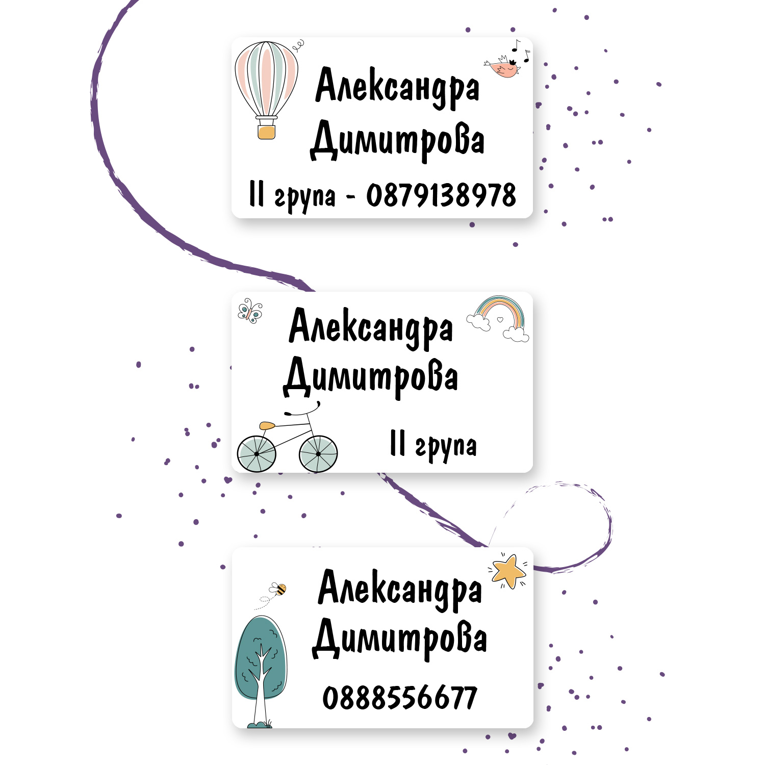 Персонализираните етикети за дрехи с дизайн Дърво, Велосипед и Балон са създадени специално за нуждите на родители с деца в ясла и детска градина. Всеки комплект съдържа 21 броя етикети с името на вашето дете на цена от 9,80 лв.
