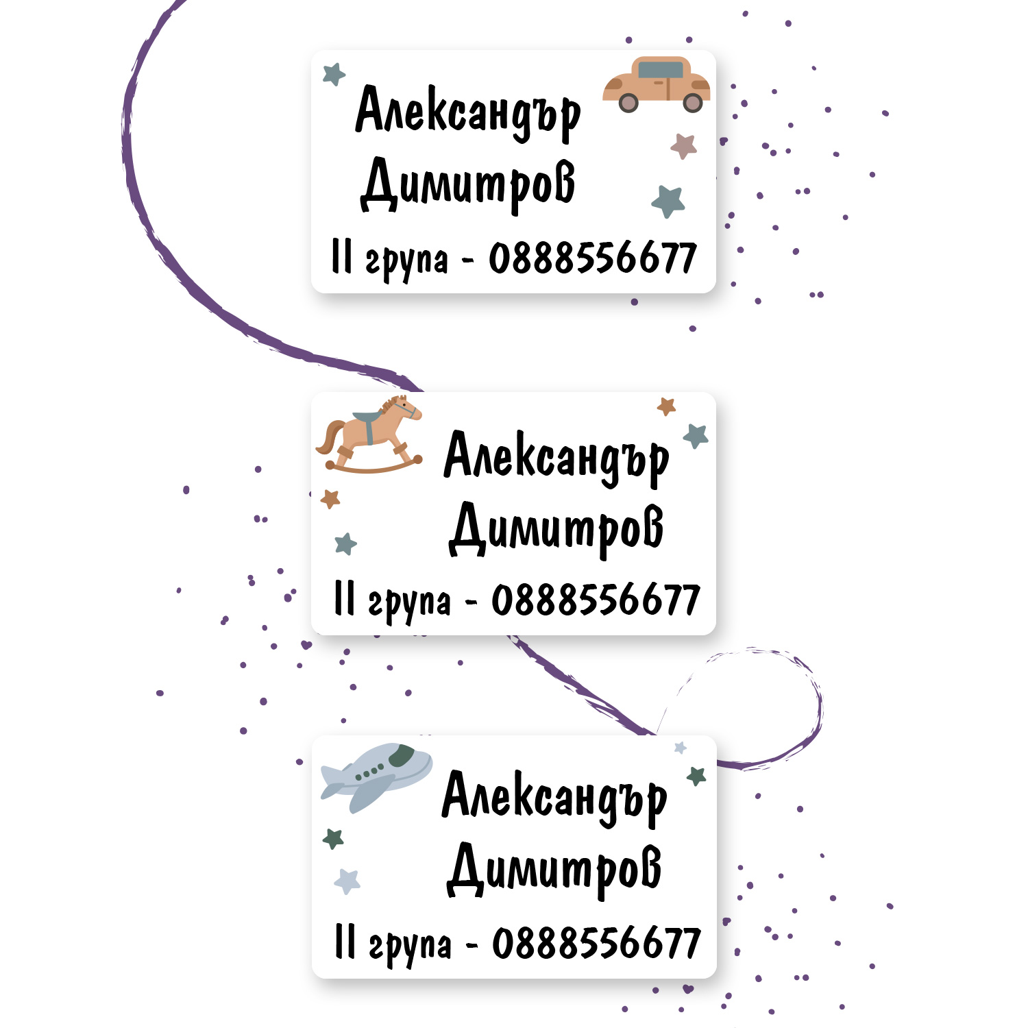 Персонализираните етикети за дрехи с дизайн Конче, Самолет и Кола са създадени специално за нуждите на родители с деца в ясла и детска градина. Всеки комплект съдържа 21 броя етикети с името на вашето дете на цена от 9,80 лв.