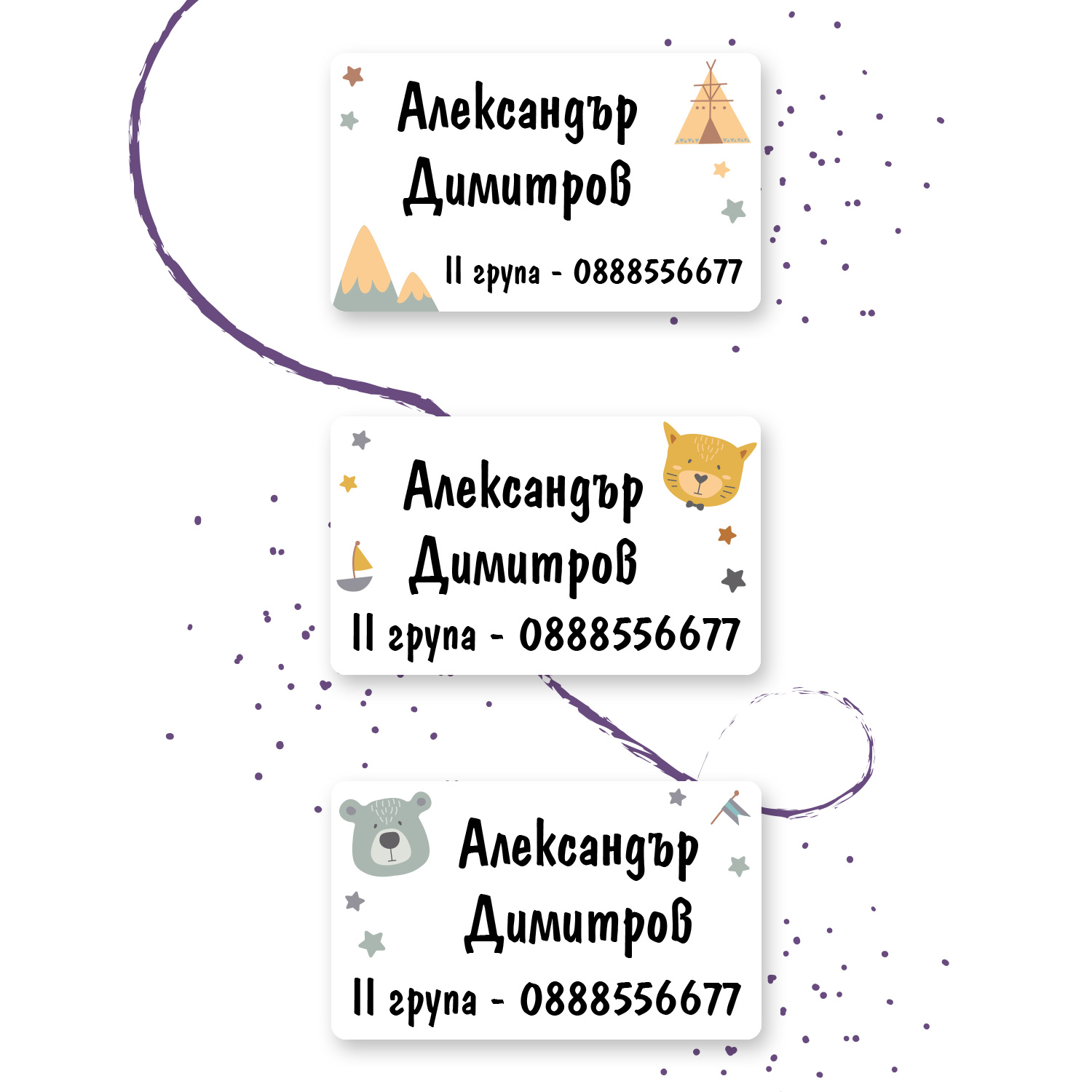 Персонализирани етикети за дрехи за ясла и градина - Мече, Котка и Палатка